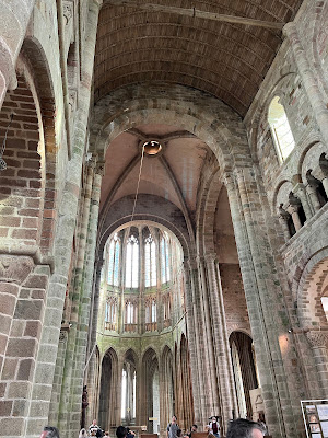 We found a nice out of the way outlook and had a picnic lunch with fresh croissants, meat and cheese. Then it was time for our tour of the Abbey at the top of the island. I don't have any idea how many stairs we climbed, but I'm guessing about 10 flights worth. (Unlike many other locales, there were no signs warning you about how high the climb was.)These are the rocks we sat on for lunch. We didn't learn until later that the island is shaped like a pyramid, so in order to build the abbey on top, they had to build around the central pile of stone and put enough supports in to carry the load of the full sanctuary at the top. These are some of the rocks that were native to the small island. They stick out here and there from the masonary of the walls.